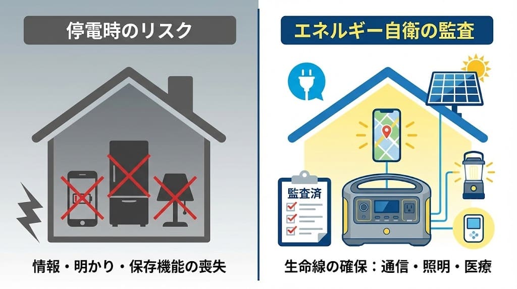 停電時でも生活と通信を維持できるよう、太陽光発電や蓄電池、マンションであればポータブル電源の導入状況を監査してください。「節電」ではなく「生命維持」のための投資です。