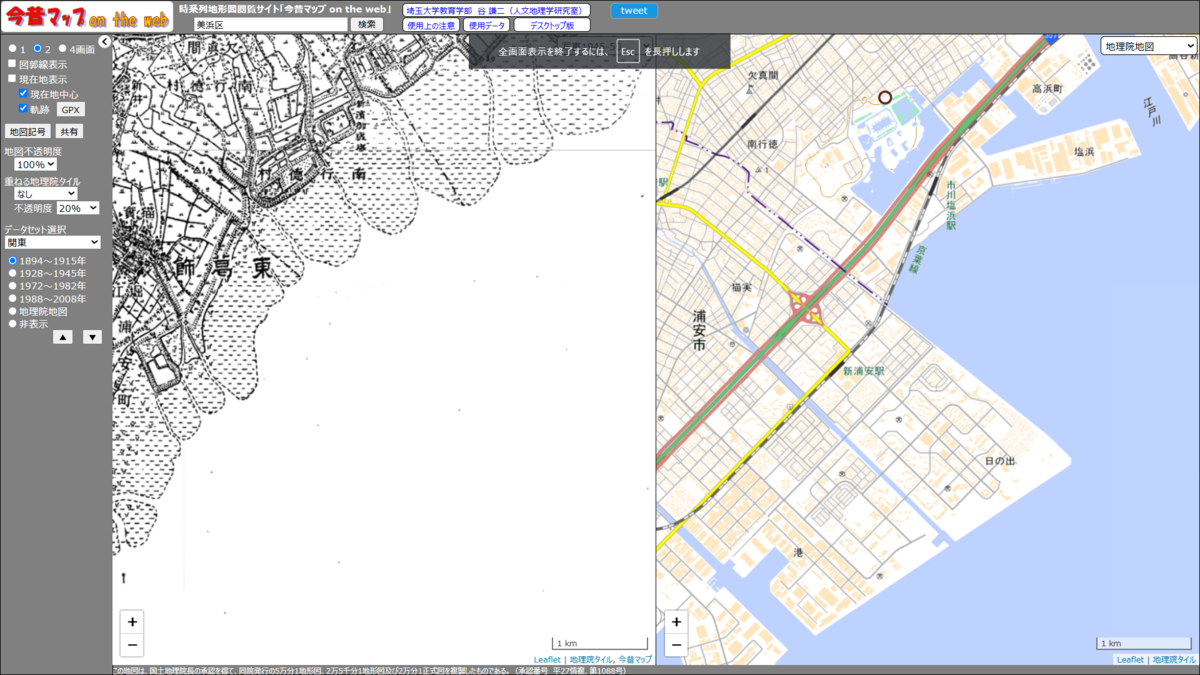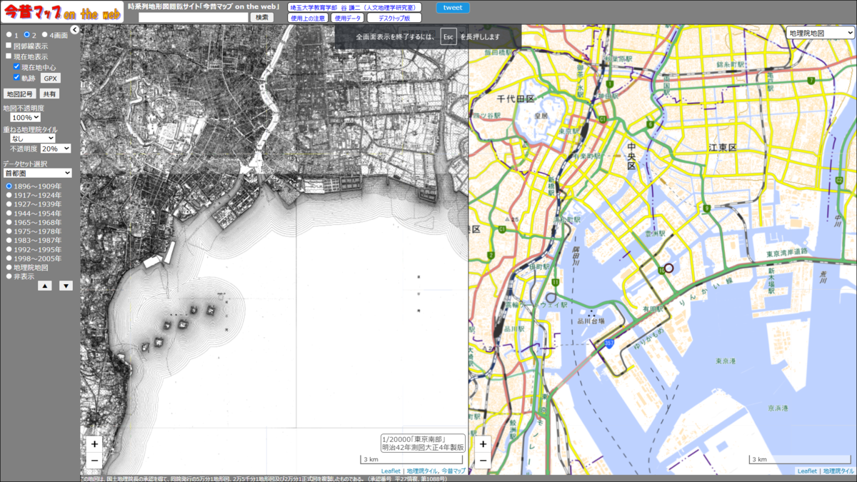 4. 右側に現在の地図を表示  → 同じ位置を現在の航空写真や地形図で比較できます。
