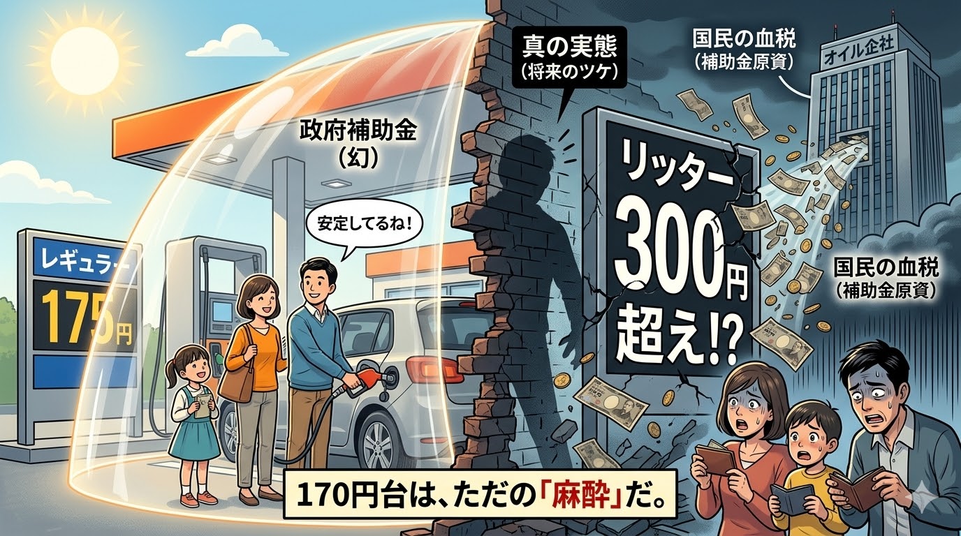 ガソリンスタンドを舞台に、政府補助金という「見せかけの安定」と「過酷な現実」の対比を描いたアイキャッチ画像。左側は、補助金のバリアに守られ175円という価格に安心する家族の風景。右側は、そのバリアの裏側で、壁が崩れて「リッター300円超え!?」という衝撃的な文字が現れ、国民の血税(お札)が吸い上げられていく中、財布を見て絶望する人々の姿が描かれています。下部には「170円台は、ただの『麻酔』だ。」という強い警告のメッセージが添えられています。
