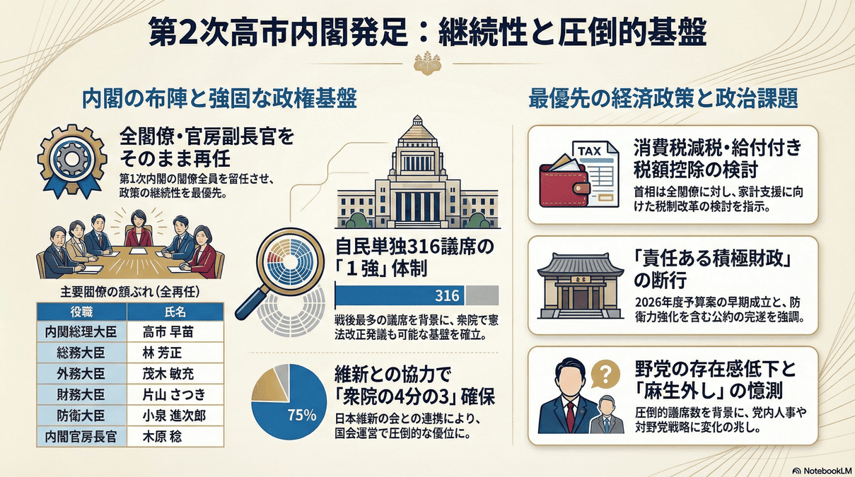 第2次高市内閣の発足は、政治ショーではなく「あなたの家計環境が激変する合図」です。全閣僚再任によるスピード感は、良くも悪くも私たちの生活を直撃します。